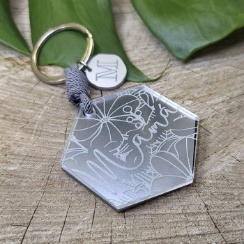 Llavero personalizado para profesores, con el mensaje “Gracias (Nombre) por tu dedicación”. Bañado en plata y montado en algodón de primera calidad.